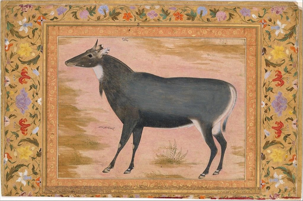ആൽബങ്ങൾക്കായി പക്ഷികളെയും മൃഗങ്ങളെയും കുറിച്ചുള്ള പഠനങ്ങളിൽ വൈദഗ്ദ്ധ്യം നേടിയ ഉസ്താദ് മൻസൂർ (1590–1624) വരച്ച നീലഗായ്