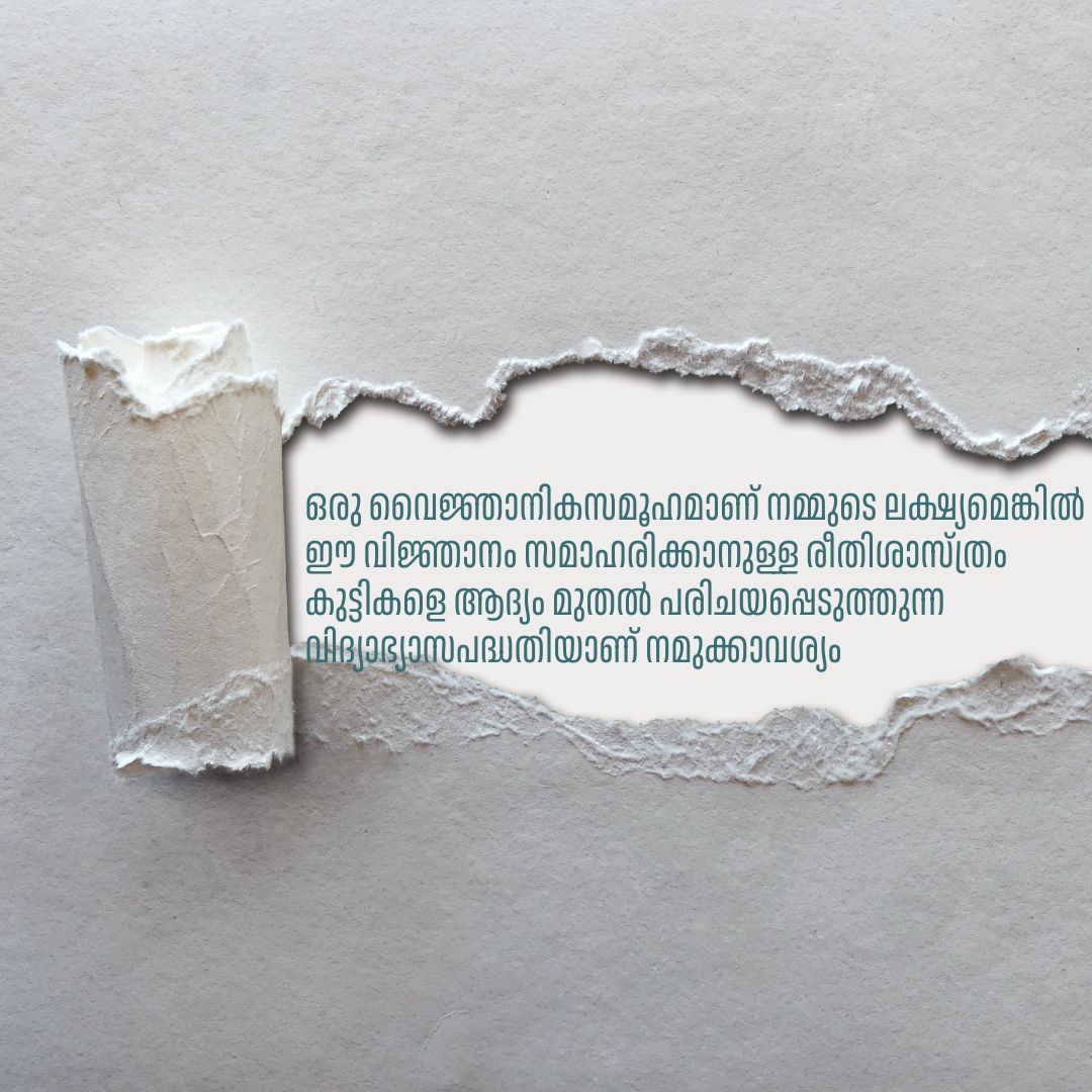 ഇന്നത്തെ നിലയില്‍ കേവലം വിവരസഞ്ചയമായി കണ്ടുകൊണ്ടോ എതെങ്കിലും ധാർമികമൂല്യസംഹിതയുടെ ഭാഗമായി കണക്കാക്കിക്കൊണ്ടോ ഉള്ള കരിക്കുലം നമുക്കാവശ്യമില്ല. ഒരു വൈജ്ഞാനികസമൂഹമാണ് നമ്മുടെ ലക്ഷ്യമെങ്കില്‍ ഈ വിജ്ഞാനം സമാഹരിക്കാനുള്ള രീതിശാസ്ത്രം കുട്ടികളെ ആദ്യം മുതല്‍ പരിചയപ്പെടുത്തുന്ന വിദ്യാഭ്യാസപദ്ധതിയാണ് നമുക്കാവശ്യം.ആധുനിക സാങ്കേതികവിദ്യകളുടെ വളർച്ച ലോകമാസകലമുള്ള ശാസ്ത്ര–സാമൂഹ്യശാസ്ത്രപുരോഗതിയെ വിവരങ്ങള്‍ എന്ന നിലയില്‍ നമ്മുടെ മുമ്പില്‍ എത്തിച്ചിട്ടുണ്ട്. അവയെ മൂർത്തരൂപത്തില്‍ കണ്ടെത്തി, മനുഷ്യരുടെ നിലനിൽപ്പിനും വികാസത്തിനും ആവശ്യമായ വിജ്ഞാനം ഉത്പാദിപ്പിക്കാനുള്ള കഴിവ് നേടുകയാണ്‌ പ്രധാനം. ഇതിന്റെ ഭാഗമായി തന്നെയാണ് ജീവിതത്തിനാവശ്യമായ മൂല്യസംഹിതകളും പൗരധർമത്തെക്കുറിച്ചുള്ള ആശയങ്ങളും മനുഷ്യര്‍ നേടുന്നത്. പുതിയ സാഹചര്യങ്ങളുമായി പൊരുത്തപ്പെടാത്ത പൗരധർമങ്ങളും മൂല്യസംഹിതകളും ആവശ്യമെങ്കില്‍ മാറ്റിമറിക്കാനുള്ള കഴിവും ഇതിനോടൊപ്പം മനുഷ്യര്‍ നേടുന്നുണ്ട്. സാമൂഹ്യപുരോഗതിക്കുള്ള അനിവാര്യഘടകമാണിത്. ഇത്തരത്തില്‍ രീതിശാസ്ത്രബദ്ധമായി പഠന സാമഗ്രികളെ ക്രമീകരിക്കേണ്ടത് ഏതൊരു പാഠപുസ്തകത്തിന്റെയും കടമയാണ്.