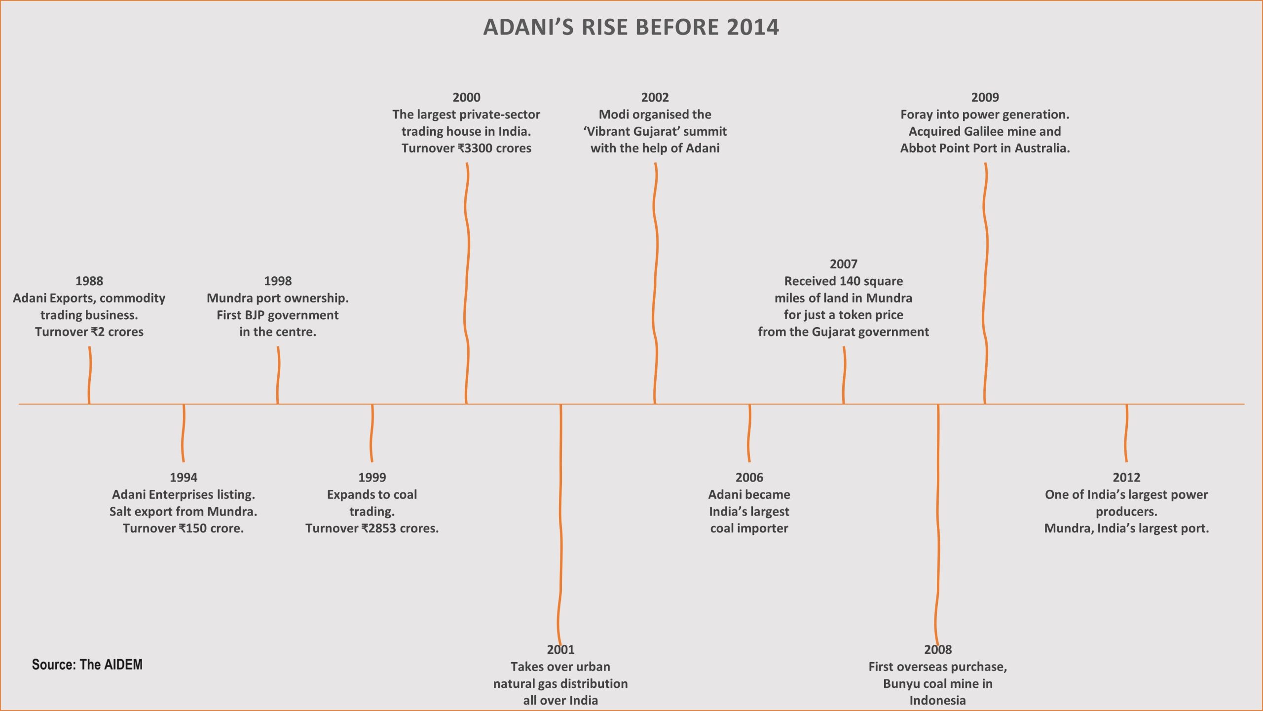 ഗൗതം അദാനിയുടെയും അദാനി എന്റര്‍പ്രൈസസ് എന്ന വ്യവസായ സാമ്രാജ്യത്തിന്റെയും ഉദയം നരേന്ദ്രേ മോദിയെന്ന ഭരണാധിപന്റെ വാഴ്ചക്കാലവുമായി പ്രത്യക്ഷത്തില്‍തന്നെ ബന്ധമുണ്ടെന്നത് ഇന്ന് എല്ലാവര്‍ക്കും അറിവുള്ള കാര്യമാണ്. 2001ല്‍ ഗുജറാത്ത് മുഖ്യമന്ത്രിയായി ഭരണത്തിലേറിയ നാള്‍തൊട്ട് പ്രധാനമന്ത്രിയായി ഒരു ദശകം പൂര്‍ത്തിയാക്കുന്നതുവരെയുള്ള കാലയളവില്‍ ഗൗതം അദാനി കൈവരിച്ച സാമ്പത്തിക വളര്‍ച്ചയിലേക്ക് വെറുതെയൊന്ന് കണ്ണോടിച്ചാല്‍ത്തന്നെ ഇക്കാര്യം ബോധ്യപ്പെടാവുന്നതാണ്. 2002ല്‍ കേവലം 3741കോടി രൂപ വാര്‍ഷിക വിറ്റുവരവ് ഉണ്ടായിരുന്ന അദാനി എന്റര്‍പ്രൈസസ് 2014 ആയപ്പോഴേക്കും 75,659 കോടി രൂപ വിറ്റുവരവുള്ള വ്യവസായ സ്ഥാപനമായി ഉയര്‍ന്നുകഴിഞ്ഞിരുന്നു. ഗുജറാത്തിലെ മുണ്ഡ്ര തുറമുഖം ഏറ്റെടുക്കുന്നതിലൂടെ തുറമുഖ ബിസിനസ്സിലേക്ക് കാലെടുത്തുവെച്ച അദാനി പിന്നീട് ഇന്ത്യയിലെ ഭൂരിപക്ഷം തുറമുഖങ്ങളും വിമാനത്താവളങ്ങളും കല്‍ക്കരി ഖനികളും ഊര്‍ജ്ജോത്പാദന നിലയങ്ങളും ഉള്ള വന്‍കിട ബിസിനസ് സാമ്രാജ്യമായി മാറിയതും നാം കണ്ടു.