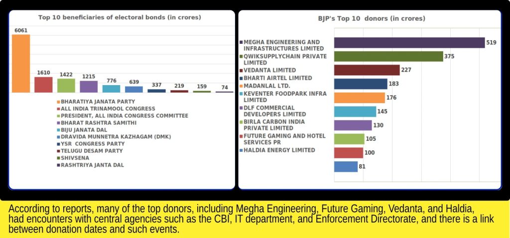 2018 ജനുവരി മുതല്‍ നടപ്പിലാക്കാനാരംഭിച്ച ഇലക്ടറല്‍ ബോണ്ട് പദ്ധതിയുടെ യഥാര്‍ത്ഥ ഗുണഭോക്താക്കള്‍ ആരെന്ന് ആദ്യഘട്ടത്തില്‍ ലഭിച്ച സംഭാവനകളുടെ കണക്കുകള്‍ തെളിവുനല്‍കിയിരുന്നു. 2018-19 കാലയളവില്‍ വിറ്റഴിക്കപ്പെട്ട ഇലക്ടറല്‍ ബോണ്ടുകളില്‍ 93%വും സംഭാവന രൂപത്തില്‍ എത്തിപ്പെട്ടത് കേന്ദ്രം ഭരിക്കുന്ന ബിജെപിയുടെ അക്കൗണ്ടിലേക്കായിരുന്നു. സംഭാവനകളിലെ സുതാര്യത എന്ന കാരണം പറഞ്ഞ് നടപ്പിലാക്കിയ ഇലക്ടറള്‍ ബോണ്ട് പദ്ധതിയില്‍ ബോണ്ടുകള്‍ വാങ്ങുന്നവരെ സംബന്ധിച്ച വിവരങ്ങള്‍ വളരെ രഹസ്യമായി സൂക്ഷിക്കാനായിരുന്നു സര്‍ക്കാര്‍ തീരുമാനിച്ചത്. പിന്നീട് ഇലക്ടറല്‍ ബോണ്ട് പദ്ധതിയെ സംബന്ധിച്ച കേസ് സുപ്രീം കോടതിയില്‍ എത്തിയപ്പോഴും സംഭാവന നല്‍കുന്നവരെ സംബന്ധിച്ച വിവരങ്ങള്‍ പൊതുജനങ്ങള്‍ അറിഞ്ഞിരിക്കേണ്ട ആവശ്യമില്ലെന്ന് കേന്ദ്ര സര്‍ക്കാരിന് വേണ്ടി ഗവണ്‍മെന്റ് അഭിഭാഷകര്‍ കോടതില്‍ അവകാശപ്പെട്ടു. ഏറ്റവും ഒടുവില്‍ സുപ്രീം കോടതിയുടെ കര്‍ശനമായ ഇടപെടല്‍ ഒന്നുകൊണ്ടുമാത്രം പുറത്തുവന്ന ഇലക്ടറല്‍ ബോണ്ട് അഴിമതി വെളിപ്പെടുത്തുന്നത് പല തരത്തിലുള്ള സാമ്പത്തിക അഴിമതികളിലും പങ്കാളികളായ കമ്പനികളും വ്യക്തികളുമാണ് രാഷ്ട്രീയ പാര്‍ട്ടികള്‍ക്ക് ബോണ്ടുകള്‍ വഴി സംഭാവന നല്‍കിയതെന്നാണ്. പലവിധ സാമ്പത്തിക ക്രമക്കേടുകളിലും ഉള്‍പ്പെട്ട കമ്പനികളെ എന്‍ഫോര്‍സ്‌മെന്റ് ഡിപ്പാര്‍ട്ട്‌മെന്റിനെ ഉപയോഗിച്ച് റെയ്ഡ് നടത്തിച്ചും ഭീഷണിപ്പെടുത്തിയും ഭരണകക്ഷിയായ ബിജെപി നേടിയെടുത്തത് ആയിരക്കണക്കിന് കോടി രൂപയാണ്.