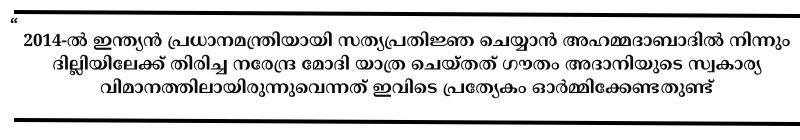 2014-ല്‍ ഇന്ത്യന്‍ പ്രധാനമന്ത്രിയായി സത്യപ്രതിജ്ഞ ചെയ്യാന്‍ അഹമ്മദാബാദില്‍ നിന്നും ദില്ലിയിലേക്ക് തിരിച്ച നരേന്ദ്ര മോദി യാത്ര ചെയ്തത് ഗൗതം അദാനിയുടെ സ്വകാര്യ വിമാനത്തിലായിരുന്നുവെന്നത് ഇവിടെ പ്രത്യേകം ഓര്‍മ്മിക്കേണ്ടതുണ്ട്. പിന്നീട് പ്രധാനമന്ത്രിയെന്ന നിലയില്‍ മോദി നടത്തിയ എല്ലാ വിദേശയാത്രകളിലും ഗൗതം അദാനിയുടെ വ്യവസായസാമ്രാജ്യത്തിന്റെ പ്രതിനിധികളും അകമ്പടി സേവകരായി ഉണ്ടായിരുന്നുവെന്നതും ഓര്‍ക്കുക.