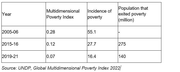 The multidimensional poverty index produced by the United Nations Development Programme (UNDP) shows the deprivation index of individuals. As per the table below, the rate of decline is not greater than what it has been since 2005.