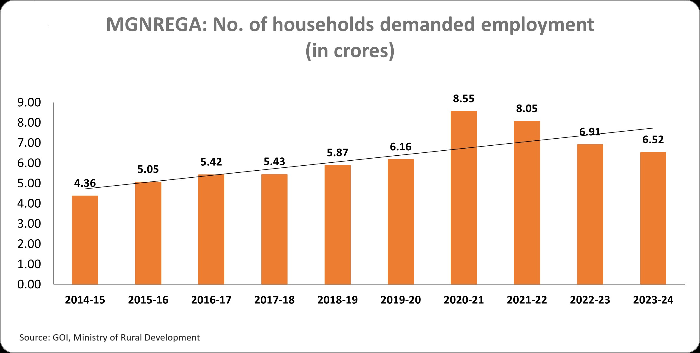 The number of households looking for work increased dramatically in 2020-21 due to the economic distress caused by the pandemic and lockdown. So, as the economy improved, the number of MGNREGA job seekers fell in subsequent years when compared to 2020-21. However, these figures remain higher than in 2019-20, just before the pandemic. In other words, the trend of increasing job seekers under MGNREGA persists.