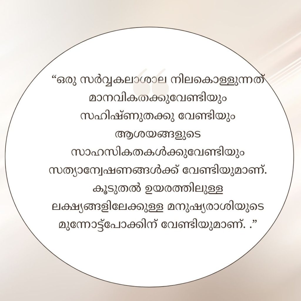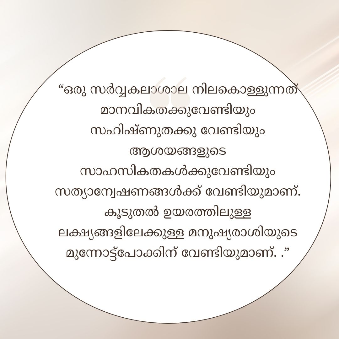 ഒരു സര്വ്വകലാശാല നിലകൊള്ളുന്നത് മാനവികതക്കുവേണ്ടിയും സഹിഷ്ണുതക്കു വേണ്ടിയും ആശയങ്ങളുടെ സാഹസികതകള്ക്കുവേണ്ടിയും സത്യാന്വേഷണങ്ങള്ക്ക് വേണ്ടിയുമാണ്. കൂടുതല് ഉയരത്തിലുള്ള ലക്ഷ്യങ്ങളിലേക്കുള്ള മനുഷ്യരാശിയുടെ മുന്നോട്ട്പോക്കിന് വേണ്ടിയുമാണ്. സര്വകലാശാലകള് അവരുടെ കടമകള് കൃത്യമായി നിര്വഹിക്കുകയാണെങ്കില് രാജ്യവും ജനതയും സംതൃപ്തരായിരിക്കും. (നെഹ്റു)